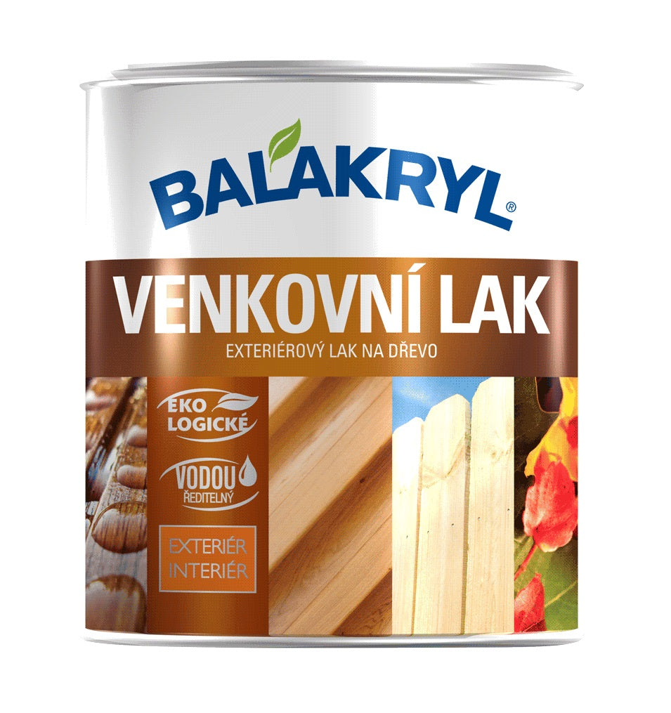 BALAKRYL VONKAJŠÍ LAK na drevo bezfarebný vodou riediteľný je vodou riediteľný hrubovrstvý akrylátový lak. Slúži na bezfarebné nátery všetkých druhov dreva a podobných materiálov v exteriéri, ale aj v interiéri. Vonkajší lak na drevo použite na nové a renovačné nátery štítov, dverí, okenných rámov, záhradného nábytku, pergol, drevených podkladov, plotov a pod. BALAKRYL VONKAJŠÍ LAK použite ako ochranný lak na zvýšenie odolnosti a zlepšenie údržby náterov vykonaných vodou riediteľnými farbami z rady Balakryl UNI. Náter je trvale pružný, rýchlo schne a má výbornú priľnavosť k podkladu. Ľahko sa aplikuje a obsahuje vysoko účinný UV filter, ktorý chráni drevo pred účinkami slnečného žiarenia a poveternostnými vplyvmi a tým zabraňuje jeho žltnutiu. Vhodny aj na nátery hračiek a detského nábytku.