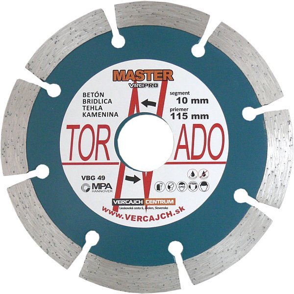 Kotúče diamantové TORNADO MASTER sú osadené v segmentoch s diamantami najvyššej kategórie a s najvyšším objemom hustoty diamantu na cm2. Kotúče Tornado Master sú určené pre profesionálnych remeselníkov práve pre ich vysokú kvalitu, dlhú životnosť. Tornado Master je určený na rezanie stavebných materiálov, ako je tehla, betón, šamot aj bridlica. Tento kotúč je už 20 rokov na európskom trhu jednotkou, čo hovorí o jeho vysokej kvalite a zároveň aj spokojnosti zákazníka. Tornado Master je určený pre suché rezanie, ale nie je vylúčené ani použitie vody, ktorá predľži jeho životnosť.
