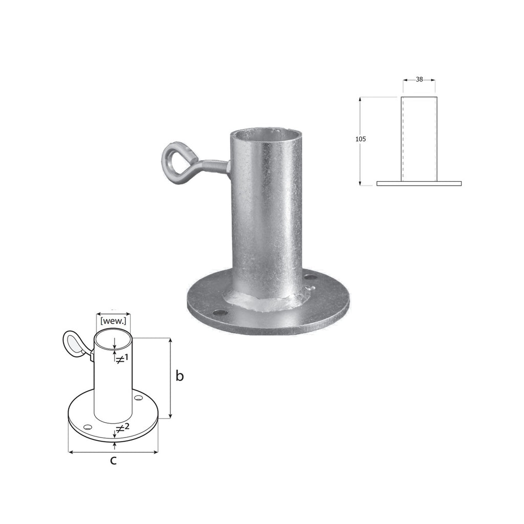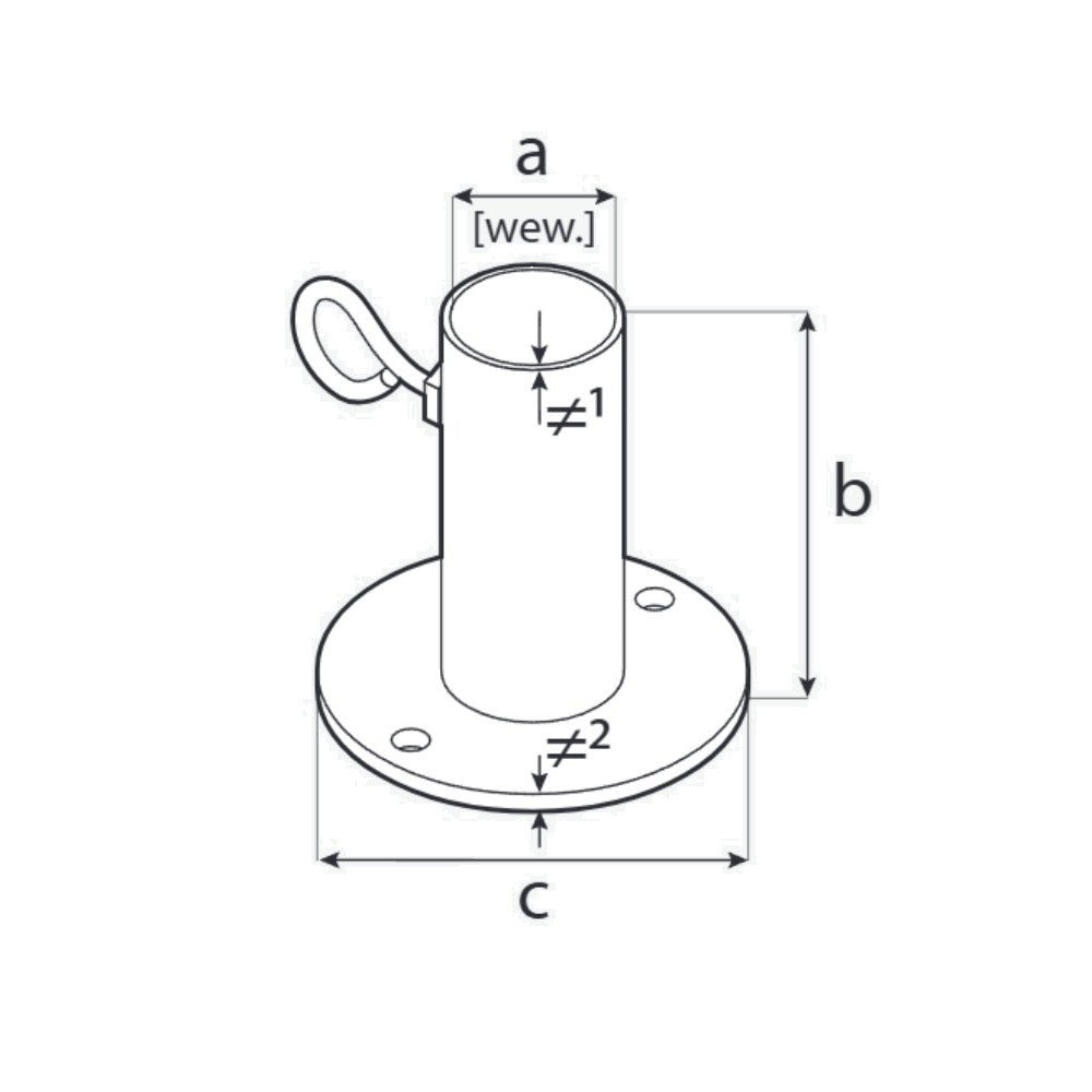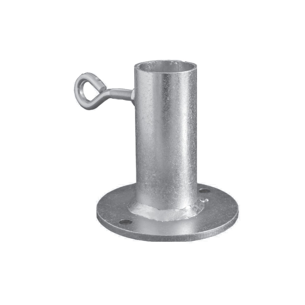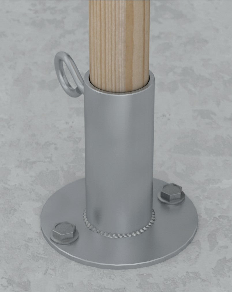 Pätka stĺpika so skrutkou „s uchom” M8, určená na montáž zvislých prvkov s kruhovým prierezom (napr. tyče slnečníka) na betóne.