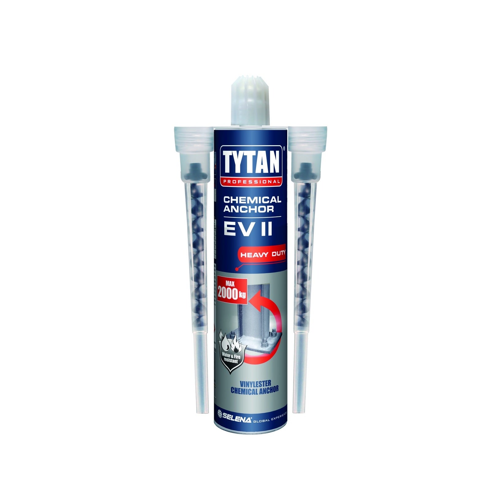 TYTAN EV II Chemická kotva vinylesterová 300 ml je vysoko účinný, rýchlo vytvrdzujúci dvojzložkový chemický kotviaci systém na báze vysoko reaktívnej nenasýtenej vinylesterovej živice v metakrylátových monoméroch. Hybridná živica po jednoduchej aplikácii vytvára pevný, odolný spoj voči chemickým látkam, ktorý je zároveň ekonomicky výhodný. Je vhodná na použitie do vlhkých podkladov. Vhodná na fixovanie: závitových tyčí, armovacích tyčí alebo akýchkoľvek upevňovacích prvkov, ako sú háky, skrutky, atď.