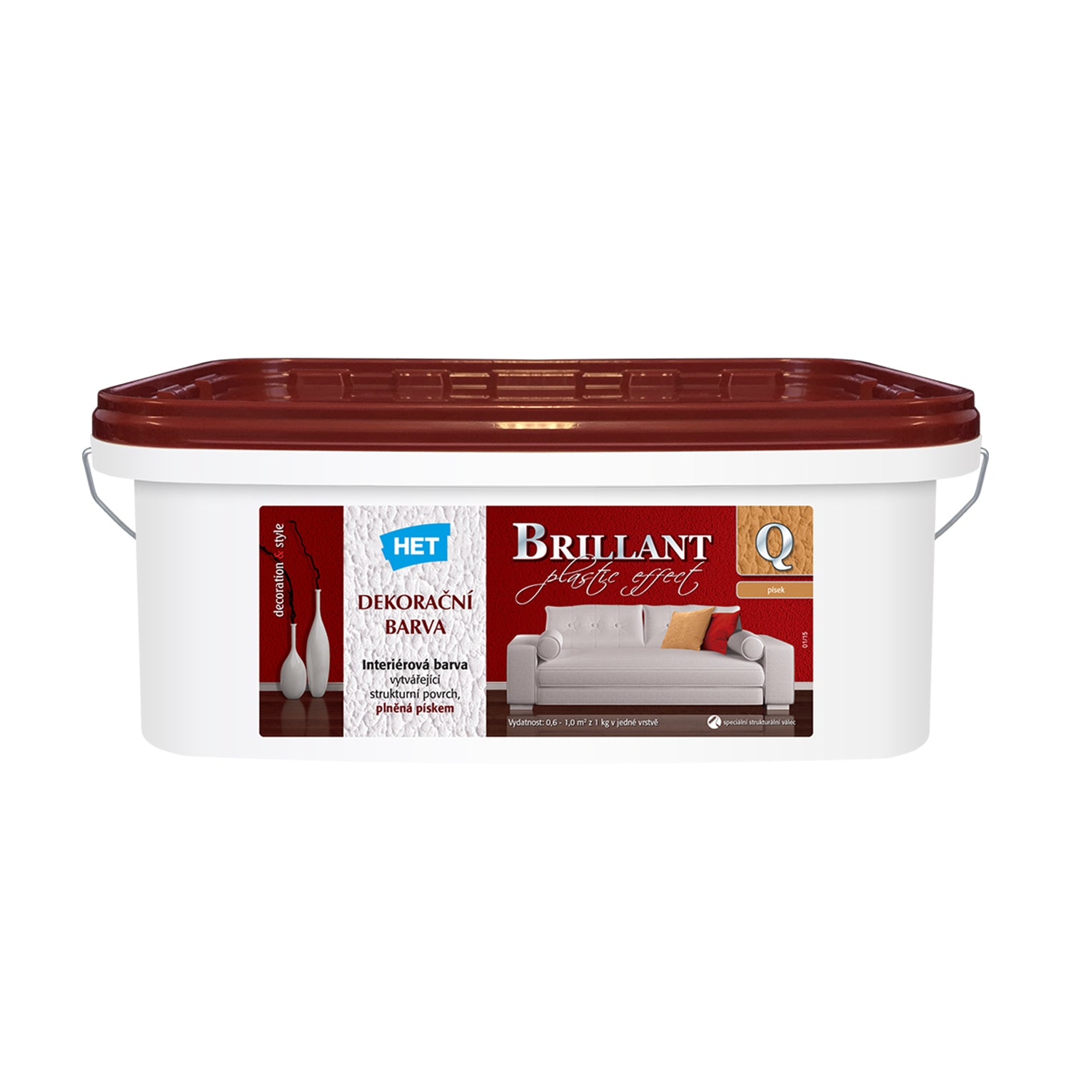 HET BRILLANT Q biela interiérová disperzná akrylátová farba na stenu je biela interiérová maliarska farba určená na štruktúrne nátery stien, vápenných, vápennocementových, sadrovápenných a sadrových omietok, sadrokartónových, sadrovláknitých a drevovláknitých dosiek, betónových panelov a monolitov a pod. Rovnako na aplikácii na podklady s kombináciou napr. minerálnych omietok a sadrokartónu. Farbu je možné použiť aj na vhodne upravené nenasiakavé podklady (napr. umakart, sololit). Náter vytvára hrubý štruktúrny povrch, ktorý je dosiahnutý použitými plnivami a typom maliarskeho valčeka. Výrobok spĺňa požiadavky pre nátery povrchov, ktoré môžu prichádzať do nepriameho styku s potravinami. Náter vytvára matný, paropriepustný povrch, ktorý je odolný voči štandardnej vlhkosti v miestnostiach. Natretý povrch nesmie byť v stálom kontakte s vodou a nesmie byť vystavený kondenzujúcej vlhkosti. Zaschnutý náter krátkodobo odolá teplote okolo 70 °C. Farba je vhodná na maľbu reprezentatívnych obývacích a komerčných priestorov, a pod.