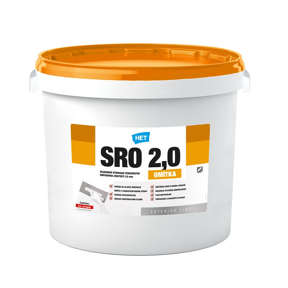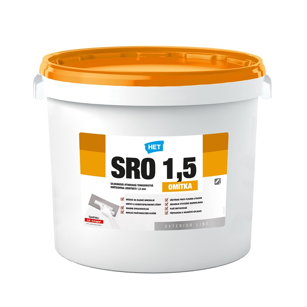 HET SRO umývateľná silikónová ryhovaná fasádna omietka je určená na konečnú úpravu povrchov stavieb, najmä kontaktných zatepľovacích systémov (ETICS). Je vhodná aj na hladké minerálne omietky, betónové panely a monolity. Je tiež súčasťou skladby ETICS HET-P a HET-M. Omietkovina je dodávaná v pastovom stave, pripravená na priame použitie, ľahko sa spracováva, má výbornú adhéziu a vytvára rovnomerne štruktúrovaný povrch. Omietka je plne umývateľná, veľmi dobre čistiteľná a odolná poveternostným vplyvom. Obsahuje významné množstvo fungicídov a algicídov v kapsľovej forme, preto nedochádza k ich vymývaniu z omietky. Povrch omietky je tak schopný dlhodobo odolávať napadnutiu plesňami či riasami.