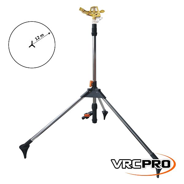 Impulzný zavlažovač kovový na trojnožke je schopný rozstrekovať vodu až do priemeru 24 metrov a je vyrobený z plastu. Trojnožka je vyrobená z odolného hliníka a má nastaviteľnú výšku pre polievanie aj nad vysokými rastlinami, do zeme sa upevňuje vďaka hrotom v dolnej časti. Záhradný zavlažovač sa ľahko používa a môžete ním zavlažovať malé aj veľké záhrady.