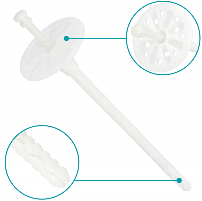 - Plastový tŕň, vďaka plastovému tŕňu sa predchádza následným tepelným mostom a korózii fasády v mieste kotvenia hmoždinky