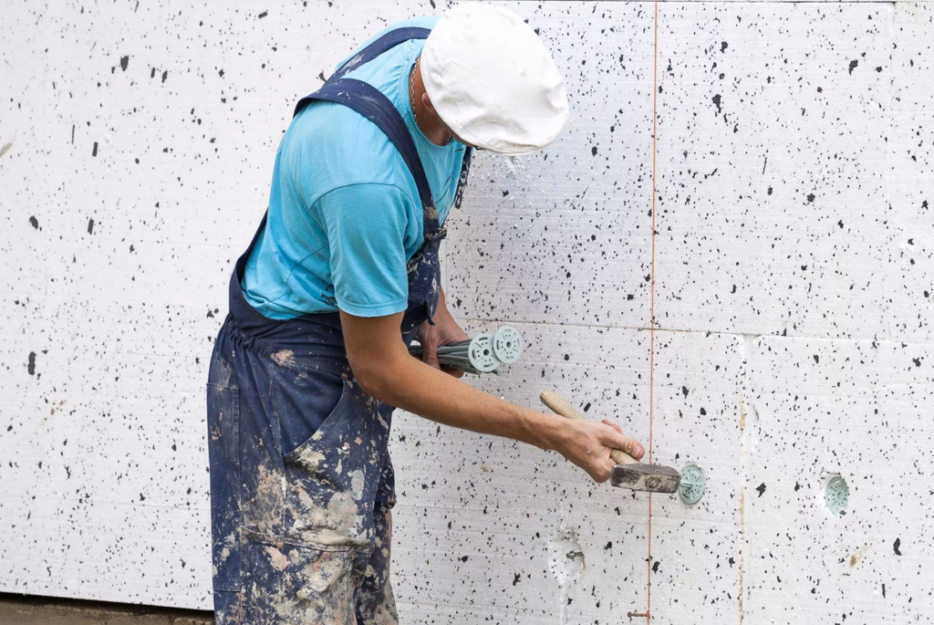 - Po namontovaní hmoždinky zakryte miesto montáže fasádnou zátkou - tzv. zápustná montáž.