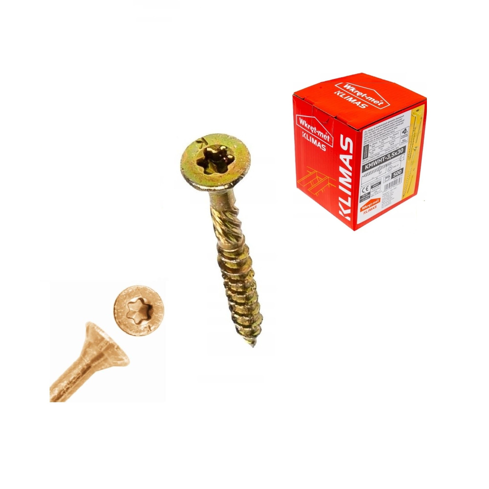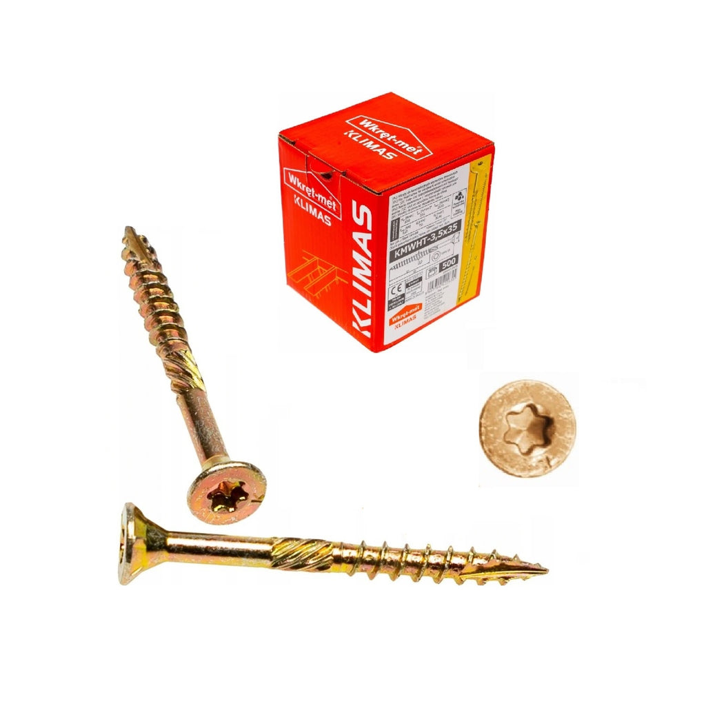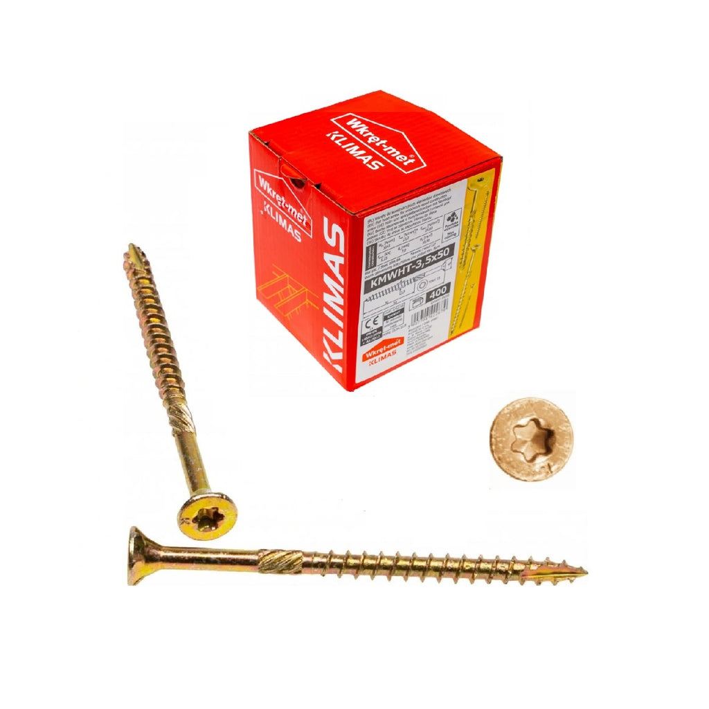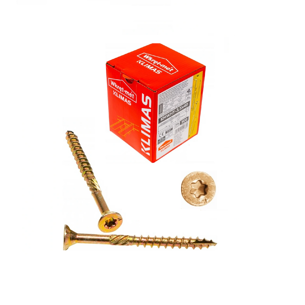 KLIMAS Wkret-met WKCS Ø3,5 mm TX-15 konštrukčná skrutka do dreva so zápustnou hlavou je konštrukčná tesárska skrutka do dreva vyrobená z nízkouhlíkovej ocele s povrchovou úpravou žltého zinku a špeciálnym voskovým náterom. Skrutky do dreva plne nahradzujú stavebné klince a nevyžadujú ani predvŕtanie. Vďaka špeciálnemu voskovému náteru sa výrazne znížil krútiaci moment pri skrutkovaní. Montáž je tým pádom rýchlejšia a jednoduchšia čo taktiež predlžuje životnosť akumulátorového náradia. Konštrukčné skrutky sa používajú na spojenie konštrukčných drevených prvkov vrátane masívneho dreva, MDF, preglejky, OSB dosky ale aj iných drevotrieskových dosiek. KLIMAS Wkret-met tesárske skrutky zápustnou alebo tanierovou hlavou sa vyznačujú vysokou pevnosťou vďaka použitému materiálu s vyšším obsahom uhlíka a následnému tepelnému spracovaniu a tak vytvárajú pevné spoje s vysokou uťahovacou silou.